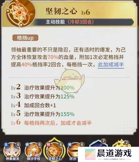 坚韧之心可以为全队进行治疗,恢复大量生命值,随后附加必定格挡效果,抵挡对方攻势,可以持续两个回合,升级后还能进一步提高回血能力。