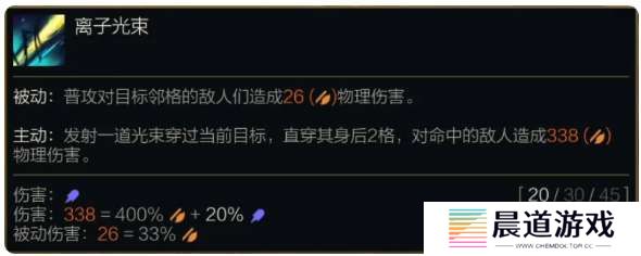 主动:发射一道光束穿过当前目标,直穿其身后2格,对命中的敌人造成(400%攻击力+20%/30%/45%法术强度)物理伤害。