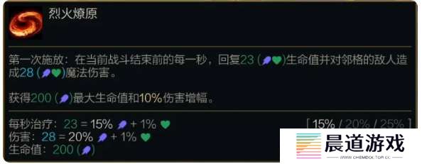 第一次施放:在当前战斗结束前的每一秒,回复(15%/20%/25%法术强度 +1%最大生命值)生命值并对邻格的敌人造成28(20%/30%/45%法术强度 +1%最大生命值)魔法伤害。