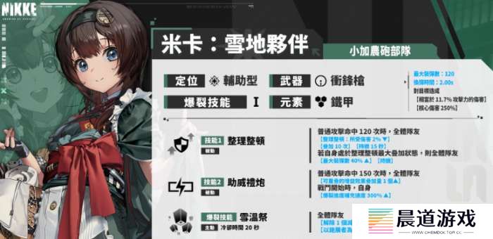 米卡在游戏中是辅助型的角色 ,元素是铁甲武器是冲锋枪。并且这个角色是一个限定角色哦,最大的效果就是能够解除我方队友所受到的简易buff,并且能够叠加增益效果,同时提升整体队伍中的攻击力和防御力。