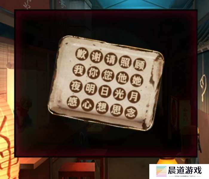 这次需要找的东西很模糊了,要清晨的特殊物品,和地上站着的npc对话一下提示上面的女孩子偶尔会回头看,所以查看一下左上角的女孩子,什么都不需要做就这么看一会女孩子就会回头,然后一个粉色的东西掉到地上,点击一下拿起来获得一个写了名字的水晶,对旁边站着的人使用水晶后后面店铺的纸就可以随便用了,但是他上面竟然有密码啊!提示是白口目。