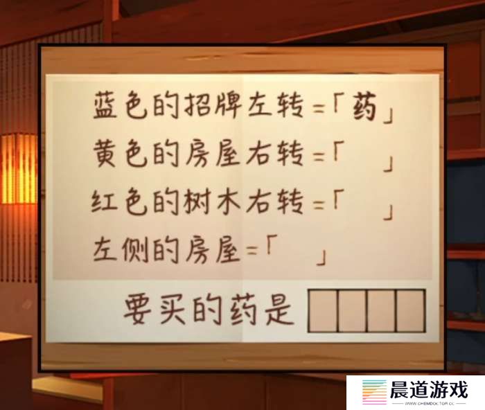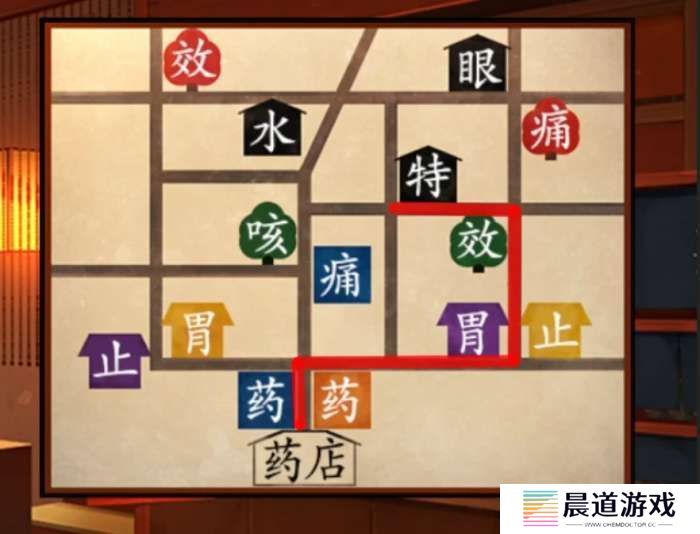 这里我们需要结合前面的反话药袋子和药店柜台上的提示和地图,首先将提示改为正话也就是橙色招牌(蓝色对面)右转=药,然后顺着走到紫色房屋(黄色对面)左转,紫色房屋是胃,再走到绿色树木(红色对面)左转,绿色树木是效,最后到达右侧的房屋是特,整理一下反过来就获得了特效胃药。