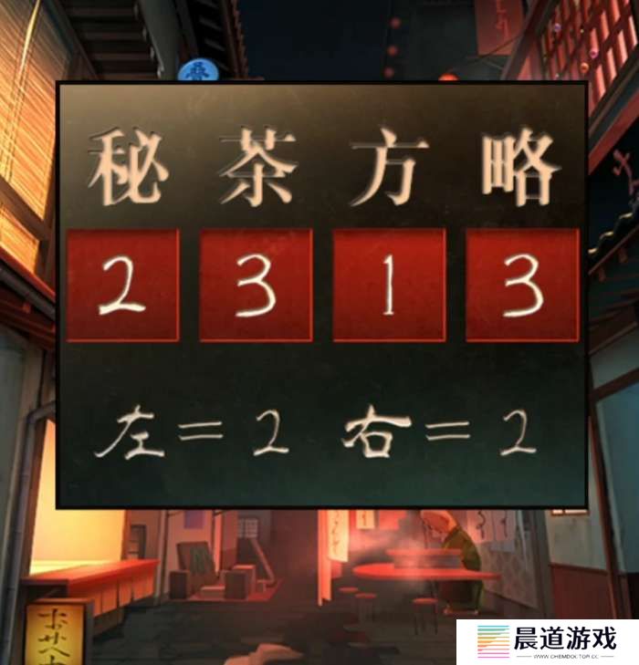 一路后退到已经空荡荡的大街上,查看左边的茶摊,戳破青蛙老板的泡泡后给他睡不着眼药水,老板表示可以送一包茶,这时候就可以选茶了,但是我们还没有足够的提示先等下。查看后面已经没有小青蛙的箱子,下面有提示左=2,右=2,你以为这个是数字?其实是误导的,我们直接无视这个提示,根据茶=*人木的提示,那么秘茶方略就能分解为秘=禾+必,茶=*人木,方=方,略=田+各,也就是秘2部分,茶3部分,方1部分,略2部分,所以我们调整数字为2313后打开柜子拿到秘制甜味料。