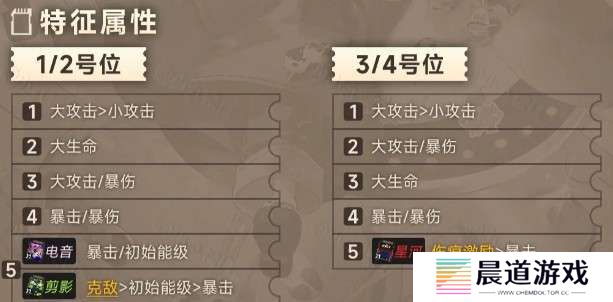 1/2号位 3/4号位 1、大攻击>小攻击 1、大攻击>小攻击 2、大生命 2、大攻击/暴伤 3、大攻击/暴伤 3、大生命 4、暴击/暴伤 4、暴击/暴伤 5、电音:(暴击/初始能级)/剪影:(克敌>初始能级>暴击) 5、星河:伤痕激励>暴击