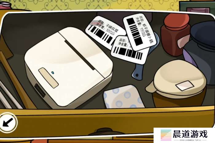继续右转到厨房,灶台的锅里拿到刀,水槽里拿到新过滤器,顺便给干毛巾沾点水,就说谁家好人家烤箱还要上锁啊!!对冰箱上的污渍使用湿毛巾就看到了一张画,中间的方框看做是箭头的话,涂黑的地方就是向下和向左的箭头了,查看一下右边柜子的抽屉,点击向左和向下的箭头打开抽屉拿到细线、螺丝刀,还有一个条形码打印机暂时用不到。