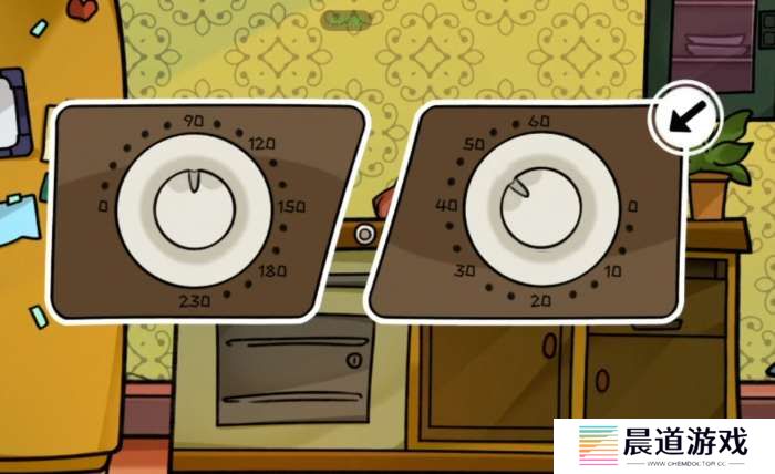 查看一下洗手池的两个抽屉,左边的是空的,右边的用鱼缸里拿到的小棍子打开拿到烤箱钥匙,注意左边计时器的刻度停在了50,下面还有个90度,这就是烤箱的线索了,右边包上有个刻度尺的提示后续注意。