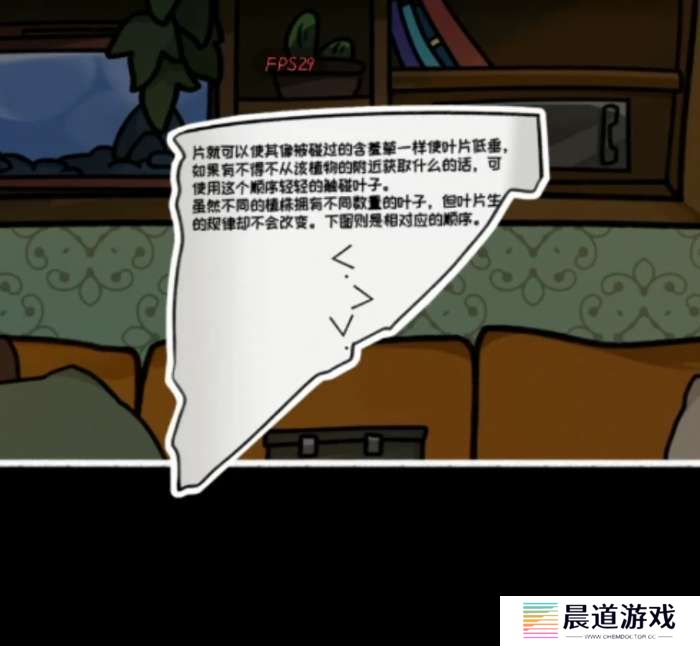 继续左转到书架场景,左边有一棵有点眼熟花,查看一下书架上的书有一页被撕掉了,那么我们前面捡到的两个半张纸拼起来就是花的点击顺序了,依次是左、右下、上左、上、左下、右,点击完毕后看到一张带颜色的纸条。
