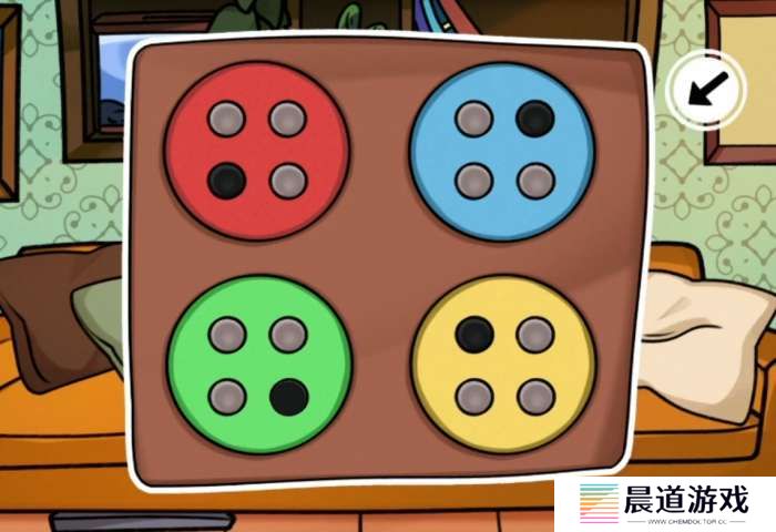 查看一下纸条记下来左上角黄色,右上角蓝色,左下角红色,右下角绿色,但是好像没有这样的线索,但是记得这四个颜色有点眼熟,回到沙发场景查看右边的椅子,把这个密码改一下描述就是黄色在左上角,蓝色在右上角,红色在左下角,绿色在右下角,将这几个位置的按键点下后果然打开了。