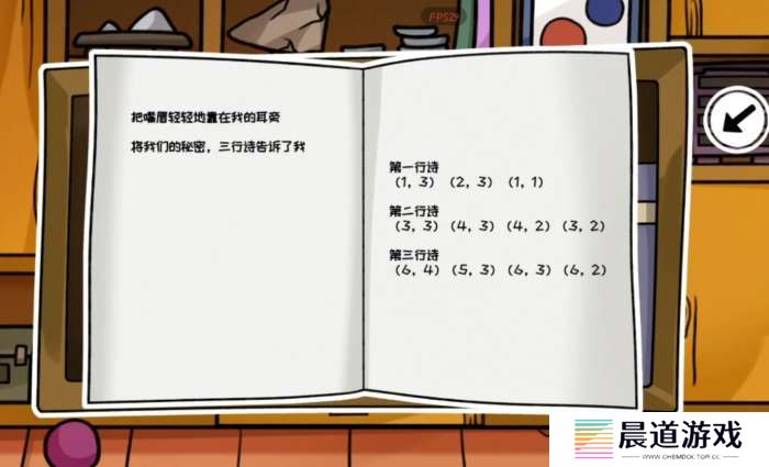 回到卧室查看左边床头柜里面的笔记本,果然这六种水果都有,按下去后点击中间的开关打开笔记本,看到一张书签,写着白色诗歌#143,书架上唯一一本需要翻页的不就叫白色诗歌,回到书架点击白色诗歌,输入页数143后打开,获得了三行奇怪的诗线索。