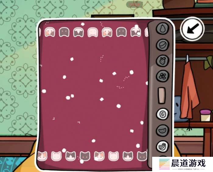 回到沙发场景,调整一下沙发下面的宝石游戏,灰色由浅到深对应的依次是紫色-蓝色-深灰-黄色-绿色-白色,调整完毕后获得菊花结的解法,注意这里如果没能打开可能就是灰色不太对,调整一下灰色的灰度就行。
