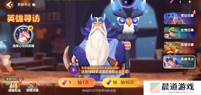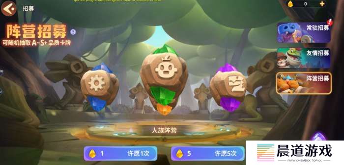 常驻招募:通过许愿石招募,每10次必出S级以上品质卡牌。友情招募:通过游戏中好友互相赠送的友情点招募卡牌,随机抽取B级以上卡牌。阵营招募:选择阵营将进行招募,可随机抽取A~S+品质卡牌。英雄寻访:开服15天后开启,可随机招募传奇英雄。