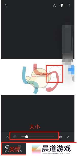 5、我们常用的液化模式就是移动,在procreate软件中叫做“推”模式,在类型上面还有一个液化大小,左边小,右边大,我们可以调整试试。