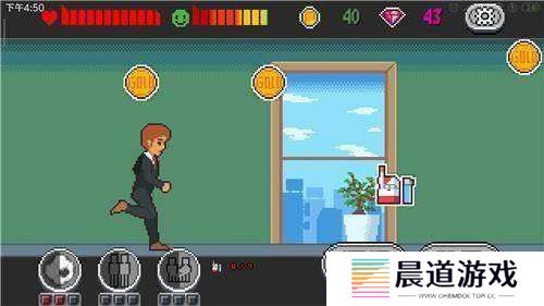 另一个就是跳跃键,可以去吃屏幕上的一些物品,不同时期出现的道具也不同,比如少年时代的书本、足球、音乐符,青年时期的金币、食物、香烟,老年的续命时钟等