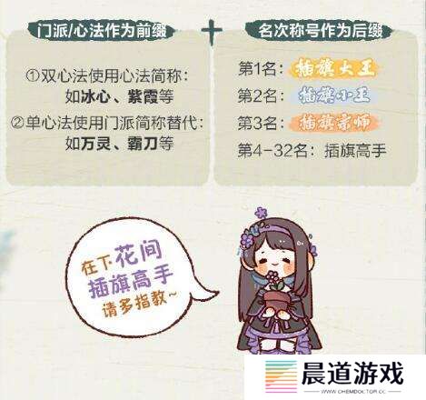 1、插旗大王称号:每周门派切磋本服排行榜第一名获得
