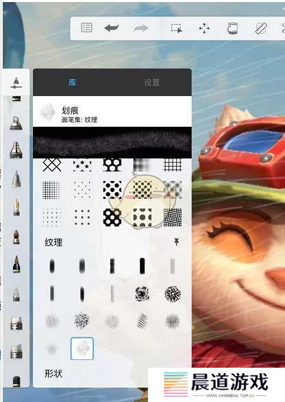 2、打开左侧【画笔库】,选择合适的肌理,小编以【划痕】为例,把尺寸调大,铺满整个画布,如图所示: