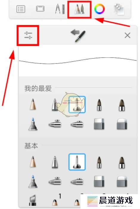 点击界面上方的“铅笔钢笔”图标,在弹出的窗口点击选择合适的画笔,点击左上角的图标。