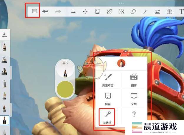 3、有可能是不小心把sketchbook中【长按激活取色器】这个功能给关闭了,我们可以点击画布的左上角设置,在弹出的小窗口中点击【首选项】,把【长按激活取色器】功能打开,这样就能使用取色器工具了,具体的操作如图所示: