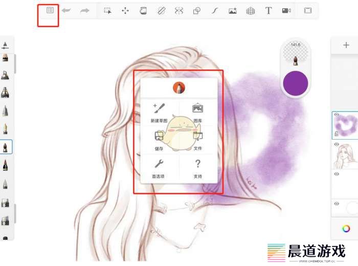 1、打开sketchbook软件,完成绘制后点击画布中左上角的图标,画布中间会弹出一个小的菜单栏,如图所示: