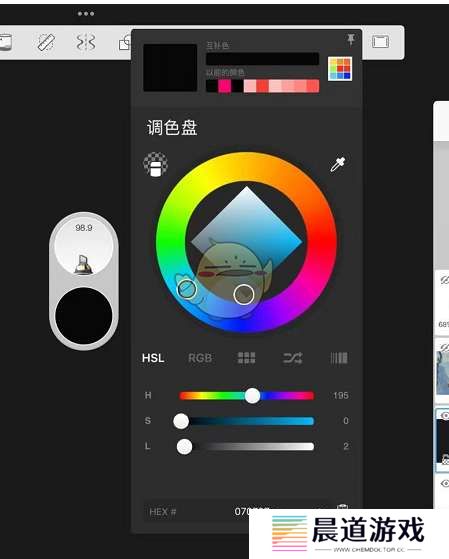 2、我们点击这个带颜色的小圆,就会进入到调色盘界面,在这里我们可以拖动上方的圆环调出自己想要的颜色,也可以通过调整HSL、RGB的数值,来进行更加精准的调色,非常的方便,如图所示: