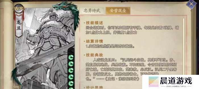 安营筑垒是龙且的一个防守技,在自己的回合结束阶段,龙且能自主选择是否将手里的手牌都弃掉,并能根据所弃的牌数来提升自己的体力上限和恢复体力。要注意,提升的体力上限是永久存在的效果,即便再次轮到龙且的回合,该效果依旧后存在,因此只要龙且能在手里留足三张牌,每回合都能稳定获得回三体力和体力上限提高三点的收益。