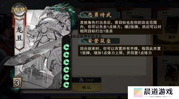 忠勇恃武是龙且的一技能,只要其它玩家的攻击目标在龙且的攻击范围内,龙且就能选择失去一点体力并从牌堆里额外摸两张牌,还能用杀再对被攻击的目标进行攻击,是很适合用来补刀和收割的神技,虽有扣体力的效果,但总体的收益很高,也使得玩家不管是在忠臣阵营还是在反贼阵营都很适合选龙且。