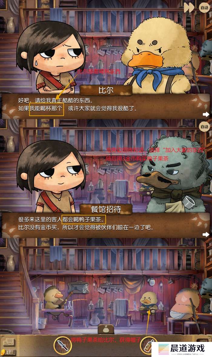 花费3个金币购买鸭子果茶给比尔,获得酷酷的帽子。