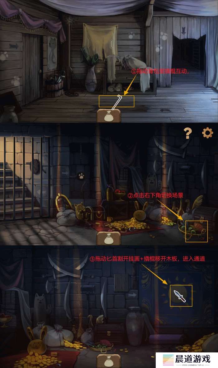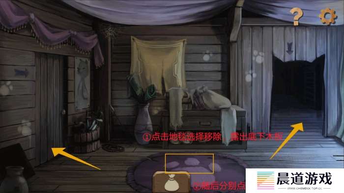 点击紫色地毯选择“移开地毯”,露出朽掉的地板,随后分别进入左侧木门和右侧猫耳门。