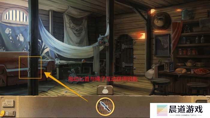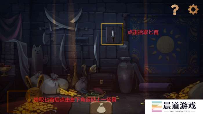 移动至右边场景中,根据提示拾取墙面上的匕首,拾取匕首后返回左边场景。