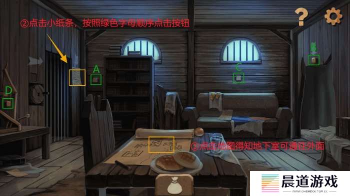 点击左侧墙上纸条查看,获得按钮顺序:“书架→猫头→阳光下→机械装置”,如图按照绿色字母顺序依次按下(A→B→C→D)。