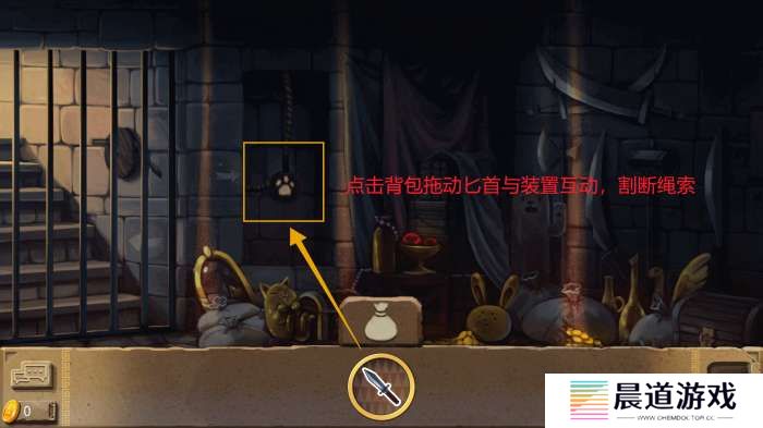 在背包中拖动匕首放至猫爪装置上割断绳子,随后多次点击猫爪打开铁门,逃出地下室。