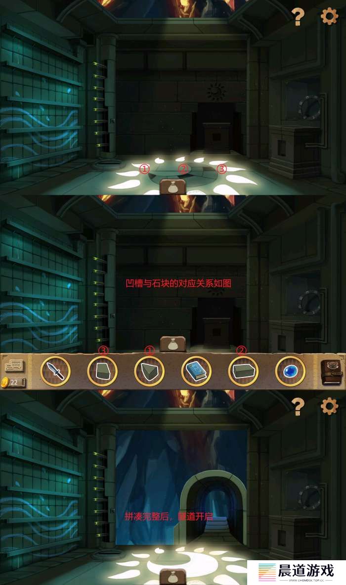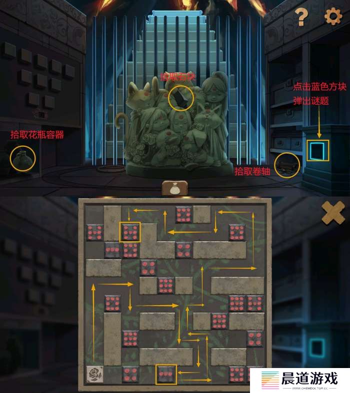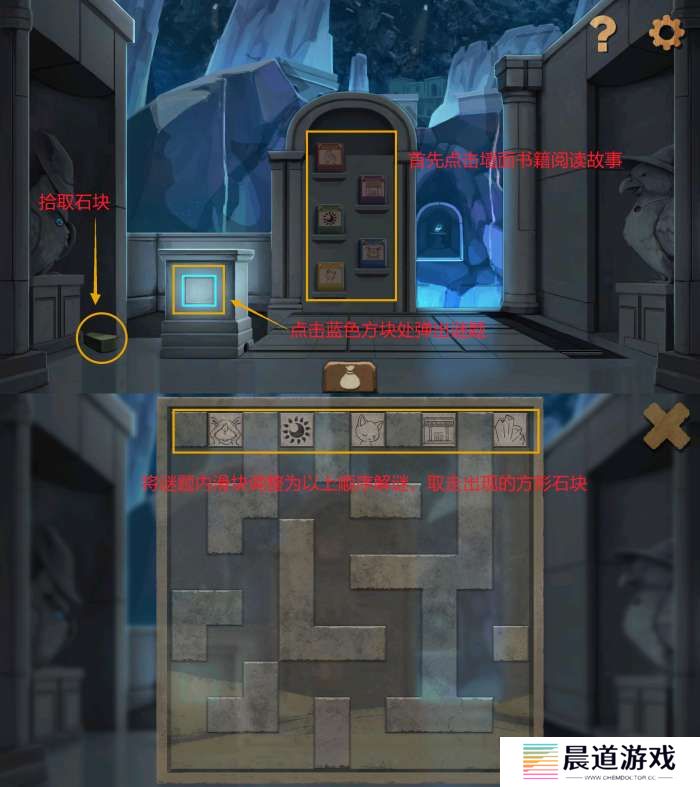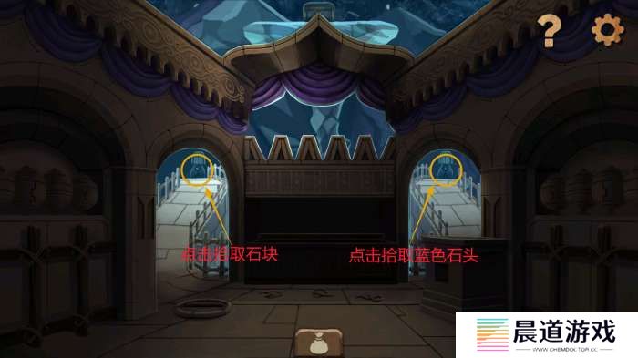 前往熊房间(自带两个向高处的台阶),原有两个台阶已通向高处。点击左右石像分别拾取石块、蓝色石头。