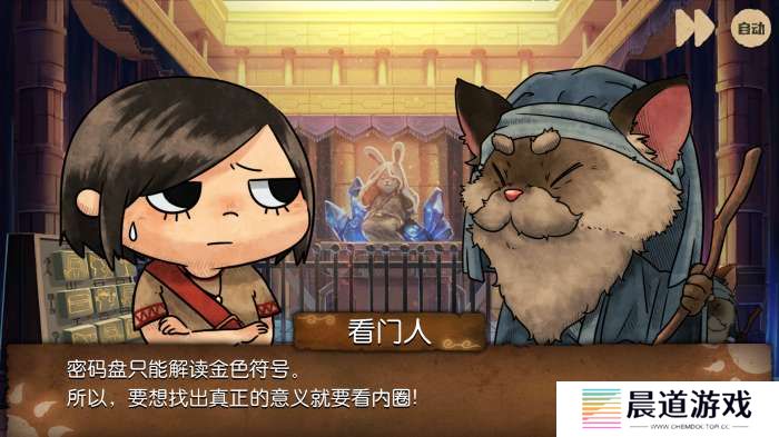 前往正殿与看门人对话,得知关键信息:密码盘只能解读金色符号,真正的意义需要看内圈。