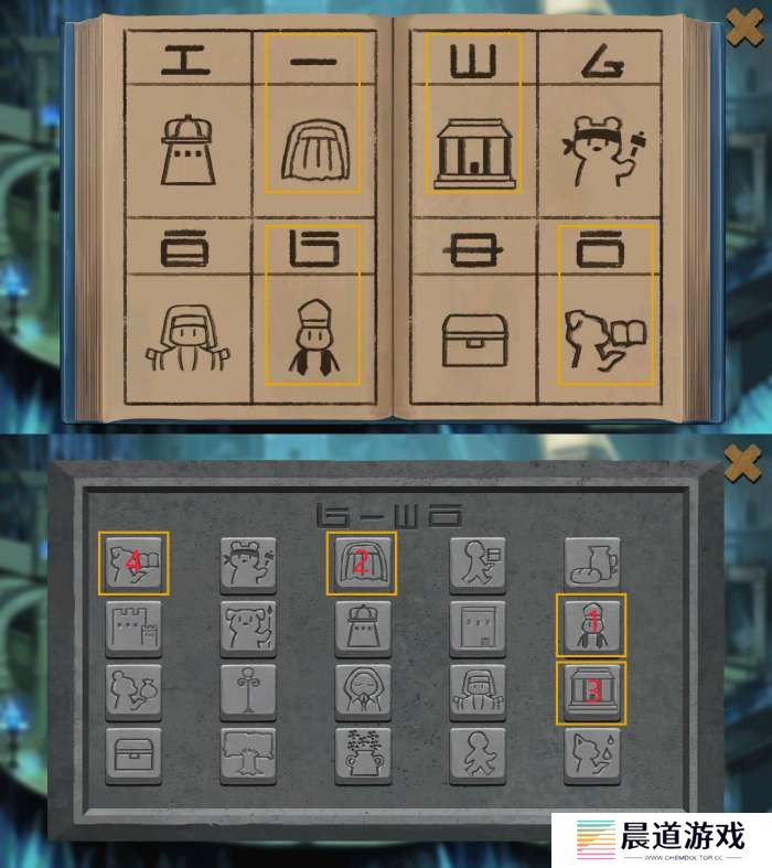 点击石台,对照辞典找到线条符号对应的形象符号。按照以下顺序点击石台按钮,解锁石台机关。
