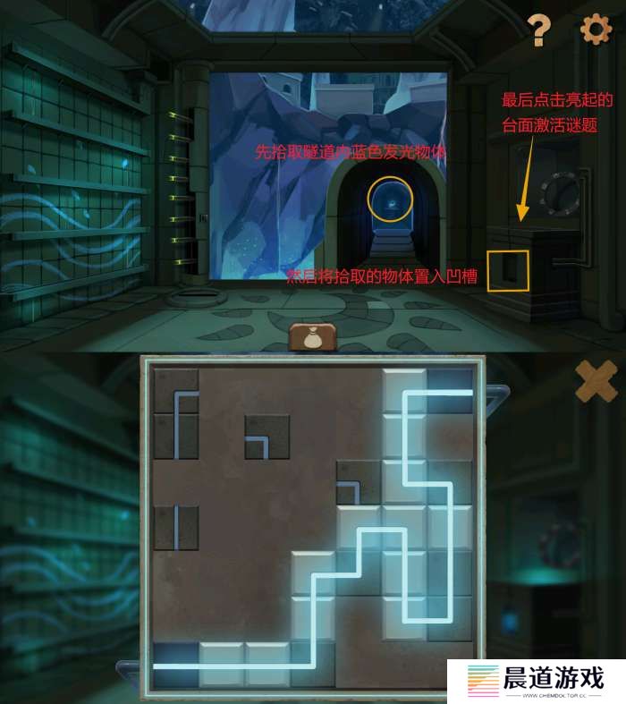 前往月亮房间,隧道连接了两端,点击蓝色发光物体拾取。将蓝色物体置入凹槽随后点击顶部蓝光开始解谜,按照如下路径连通两端管道,随后拾取台面上的密码盘部件。
