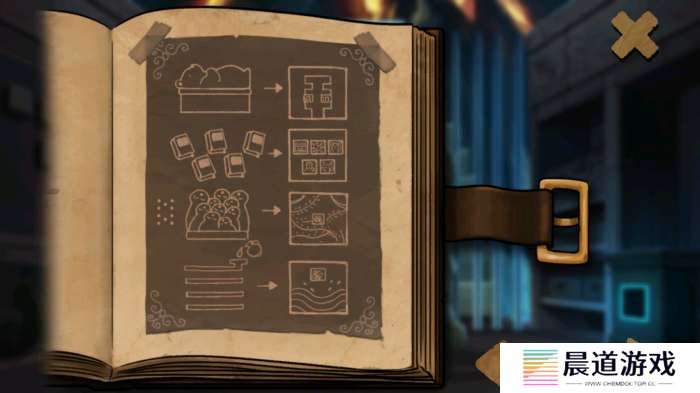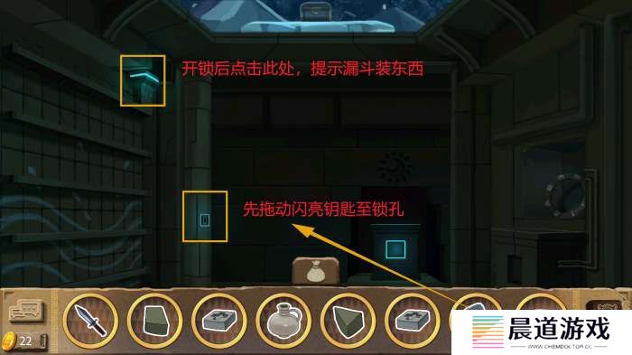 外部:一个高处的宝箱用刚获得的闪亮钥匙打开锁孔,点击发光的漏斗,根据墙面水纹及应该装东西进去的提示。