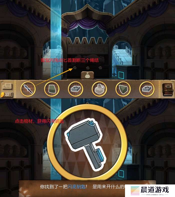 外部:自带两个石梯 内有瀑布与水槽,可以注意到之前的雕像房间也有类似的接水凹槽。先用匕首割断3处绳子,随后打开棺材看见对应的图案并拾取物品-闪亮钥匙。