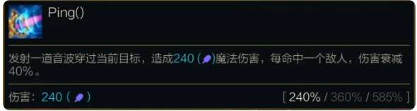 发射一道音波穿过当前目标,造成(240%/360%/585%法术强度)魔法伤害。每命中一个敌人,伤害衰减40%。